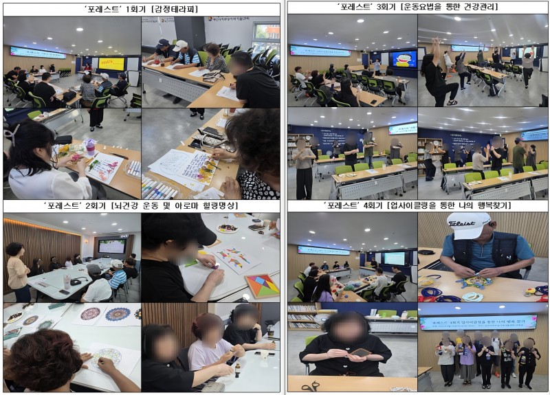 2025년 지역특화사업으로 자활사업 참여주민 대상 정신건강(스트레스, 우울감, 정서회복)과 신체건강(활력감, 자기돌봄) 회복을 위한 통합형 치유 프로그램 “포:레스트(For:Rest)” 를 총 5회기 진행하였습니다. 앞으로도 자활 근로 참여 주민의 정서적 안정감 회복 및 삶의 질 향상, 자활의지 고취를 위해 노력하겠습니다.