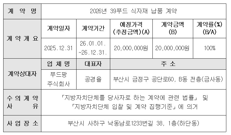 [39푸드] 식자재 납품 수의계약 내역 공개 페이지 정보 작성자 최고관리자 작성일25-12-31 11:45 조회16회 관련링크 이전글 다음글 프린트 목록 본문 이전글 다음글 프린트 목록